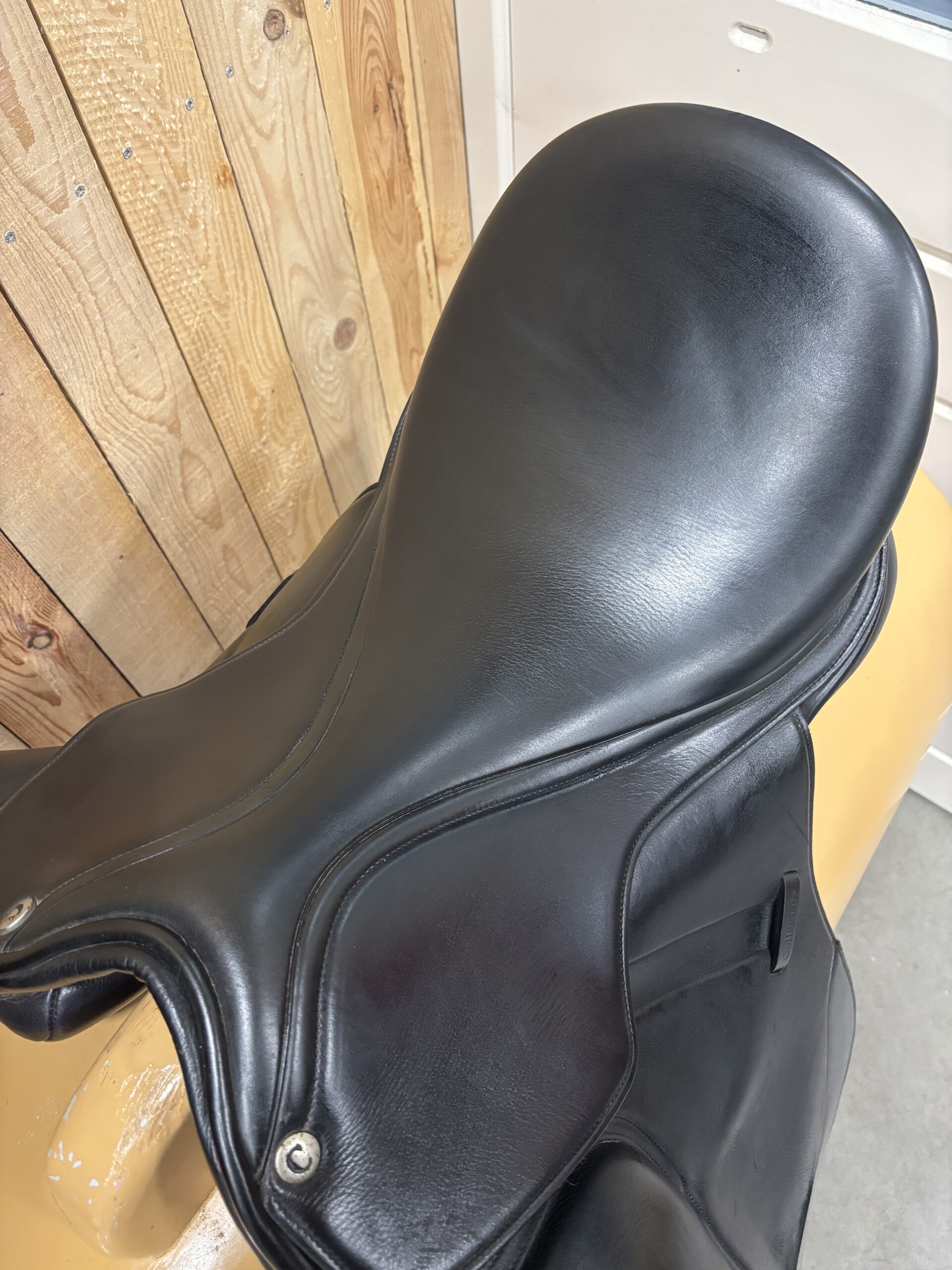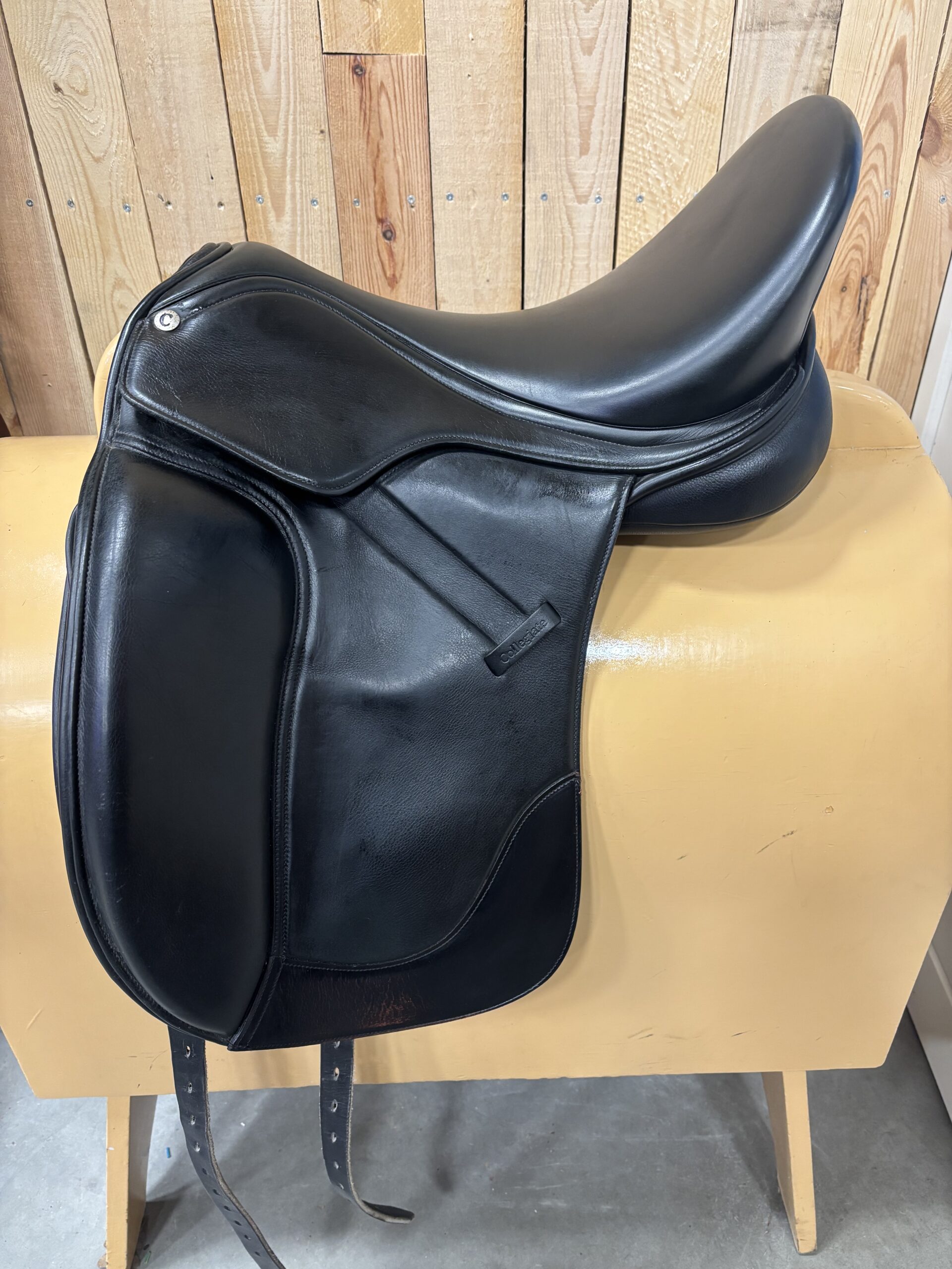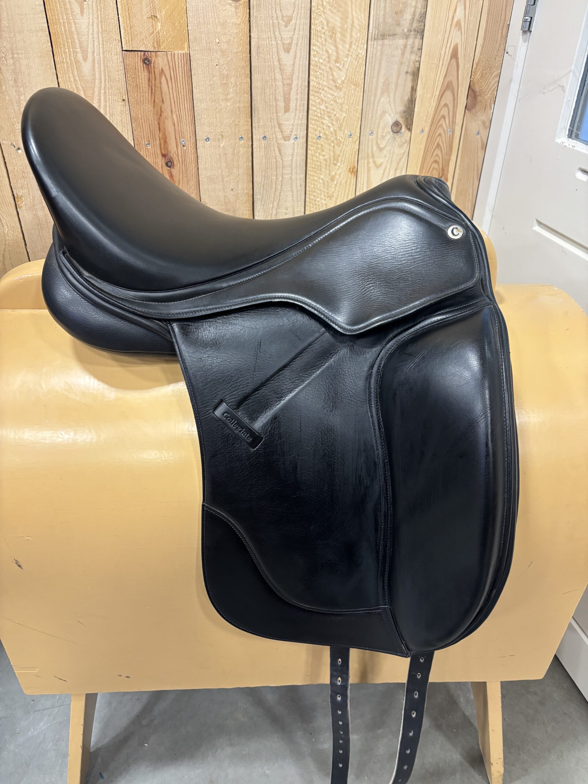 Collegiate 17.5 inch dressuurzadel met een medium kopijzer. Zadel is zwart.
