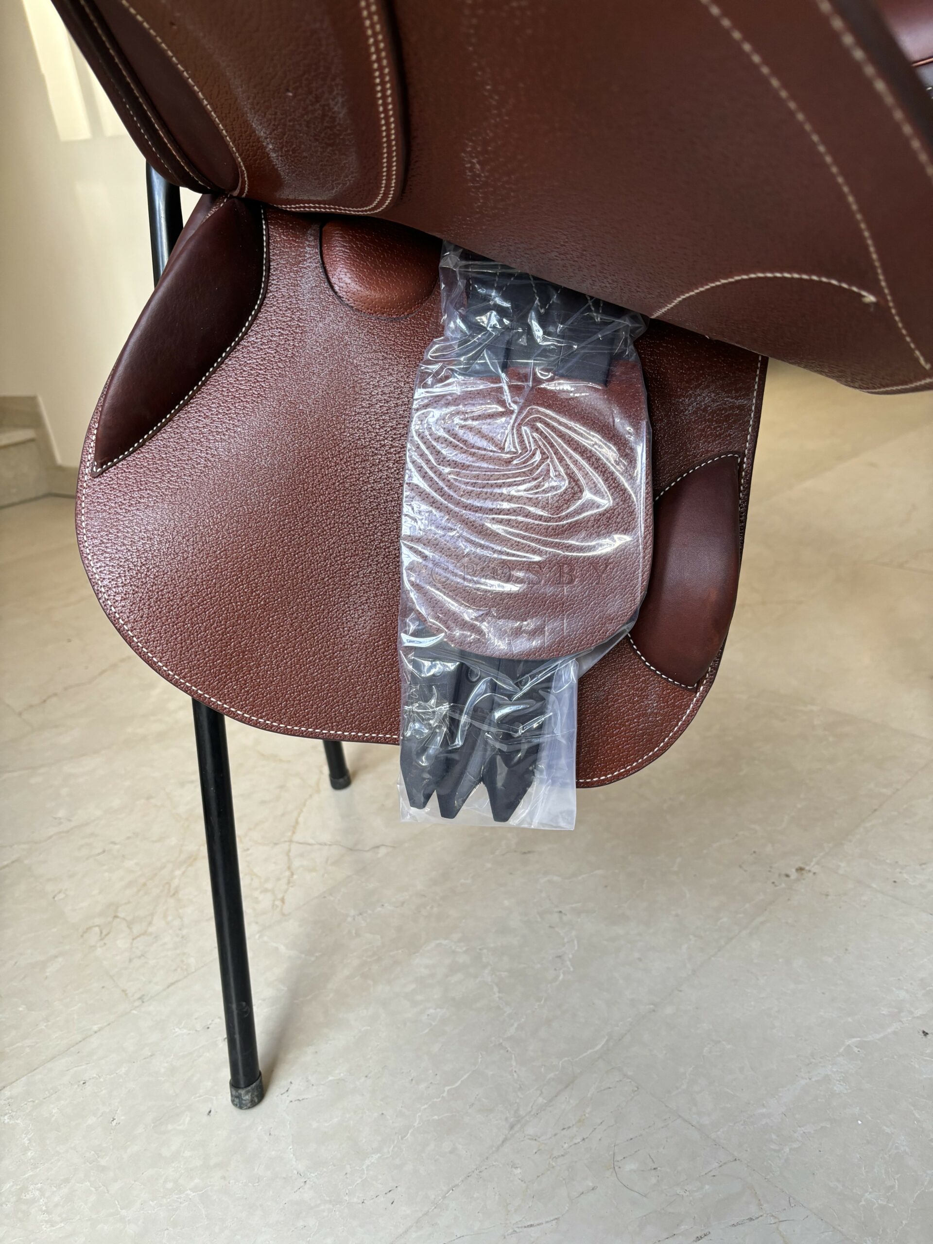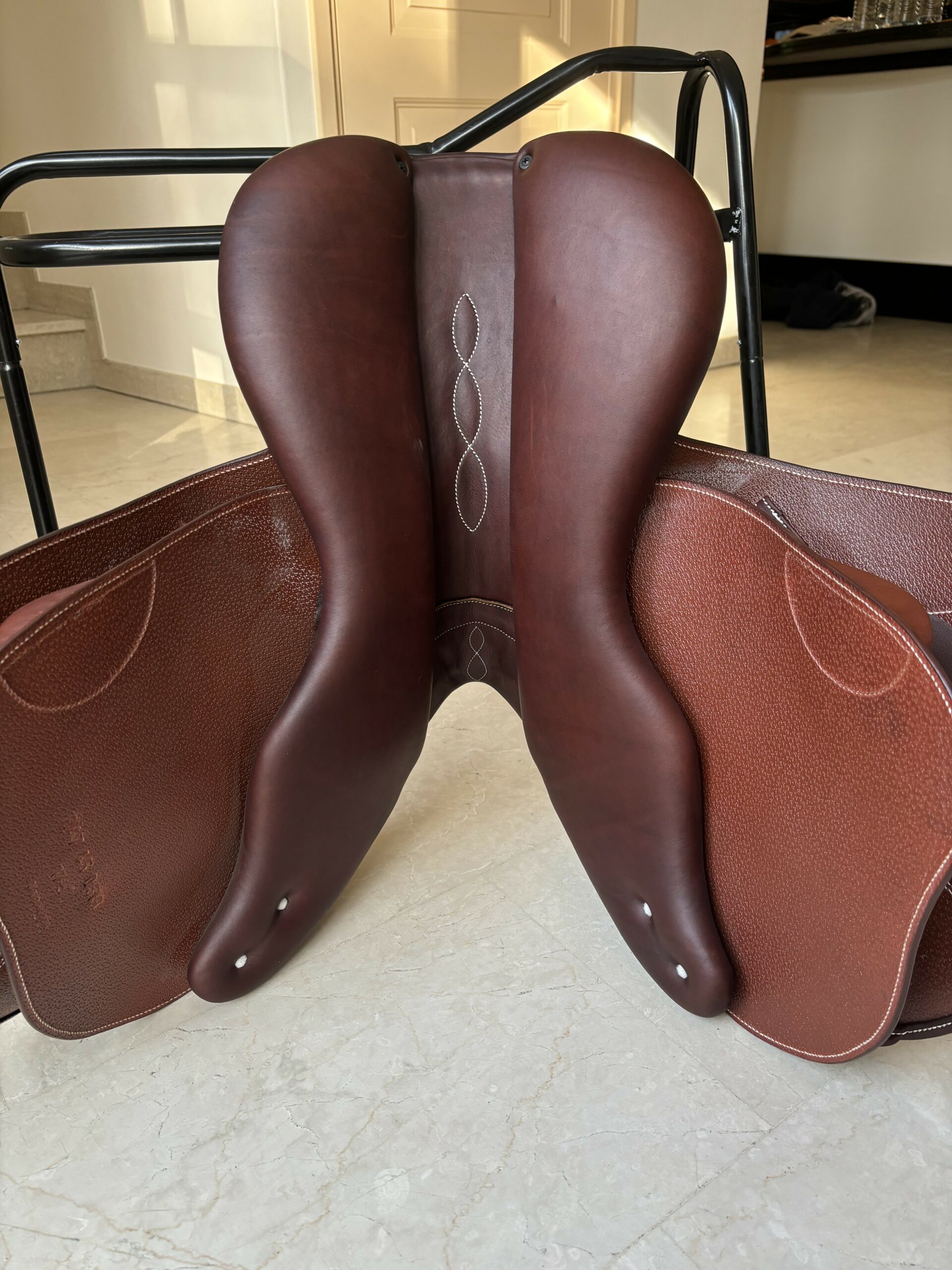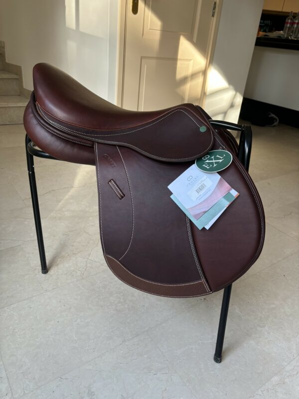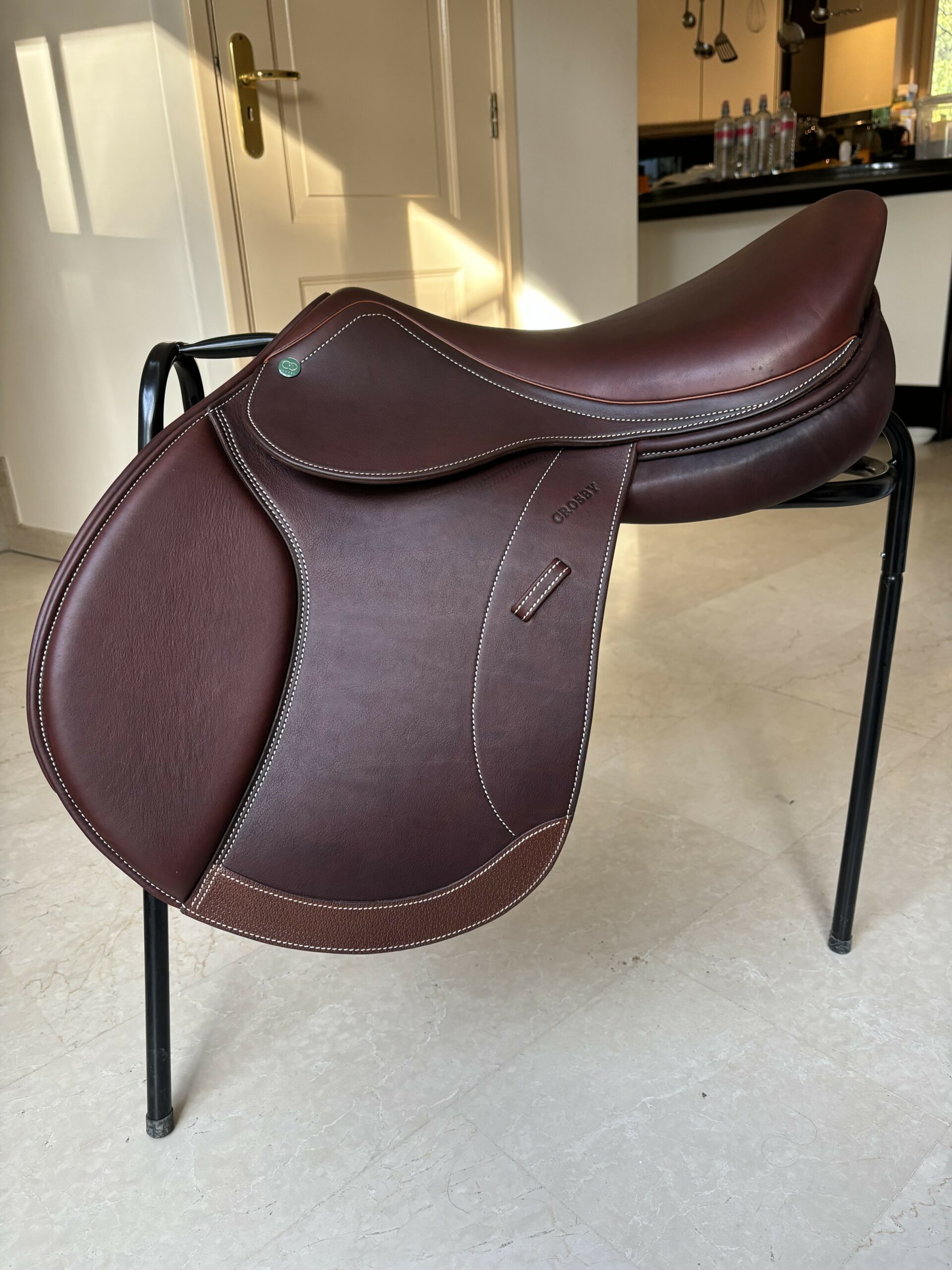Crosby Springzadel 17.5 inch met verwisselbaar kopijzer, momenteel zit er medium in. Zadel is geschikt voor ronde paarden. Zadel is bruin.