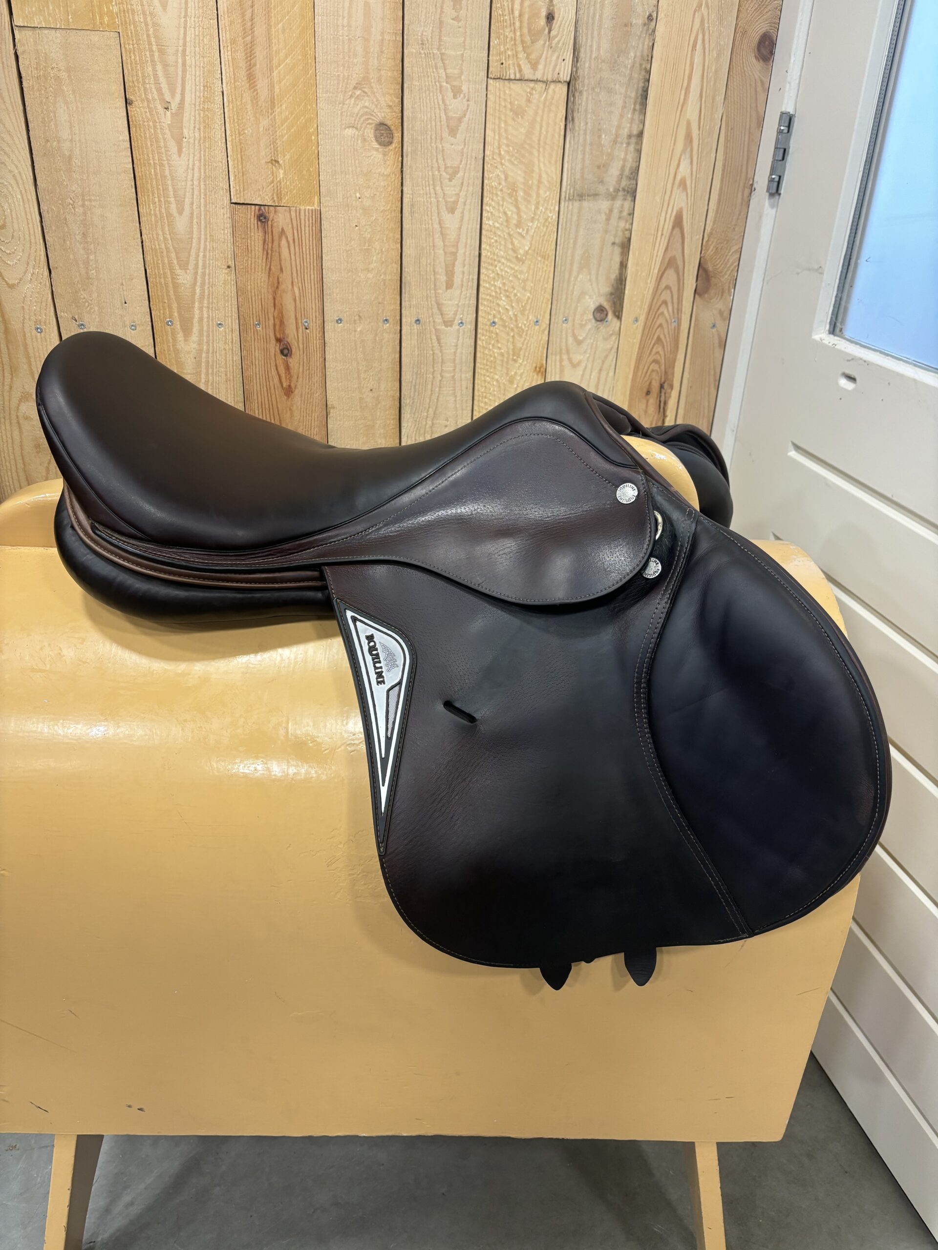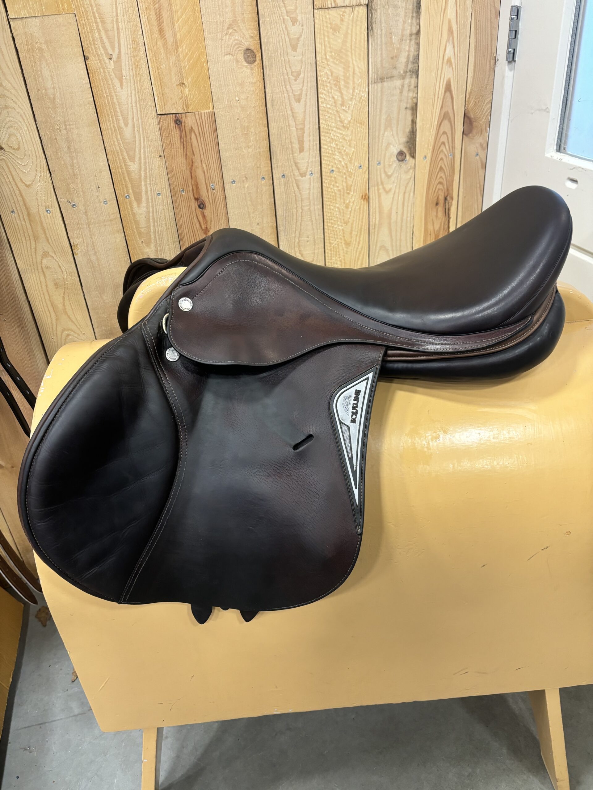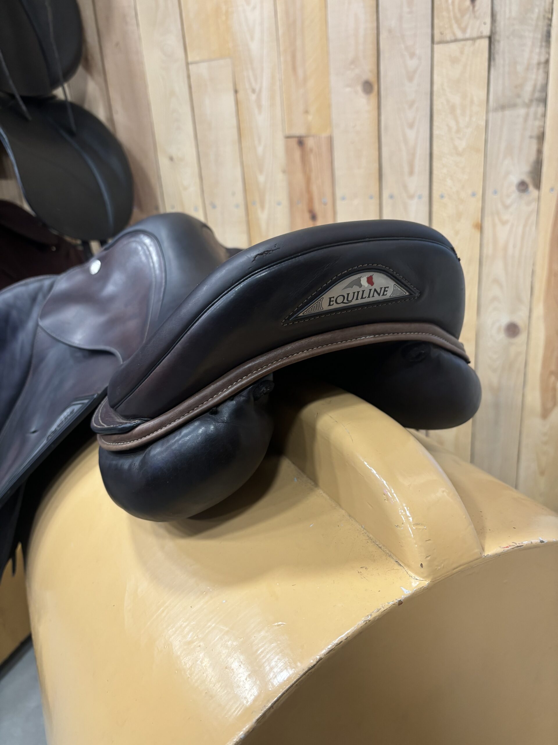 Equiline 18 inch springzadel met een medium (bij Equiline 33) boommaat. Heeft wat gebruikersporen op de lepel. Zadel is bruin.