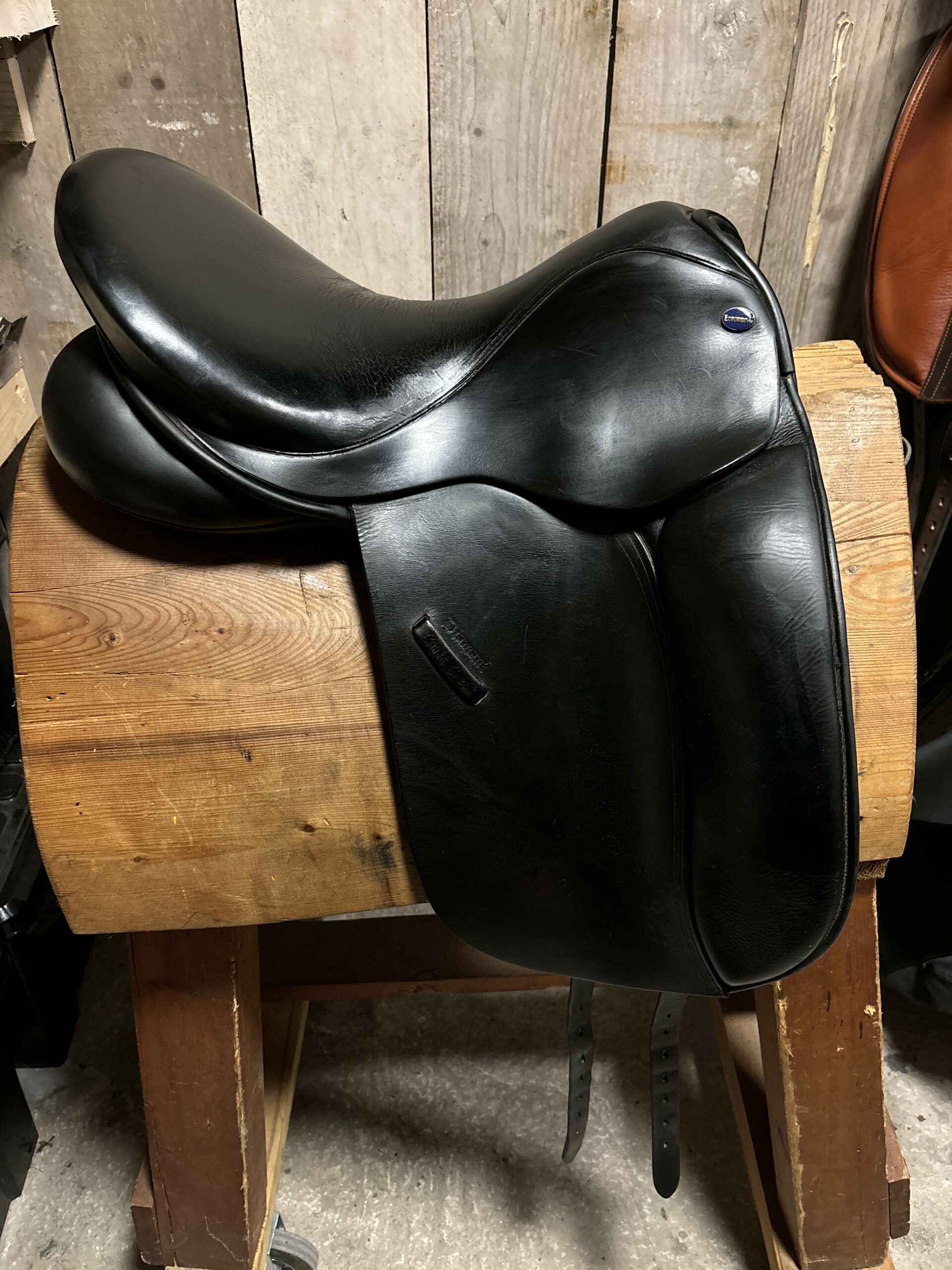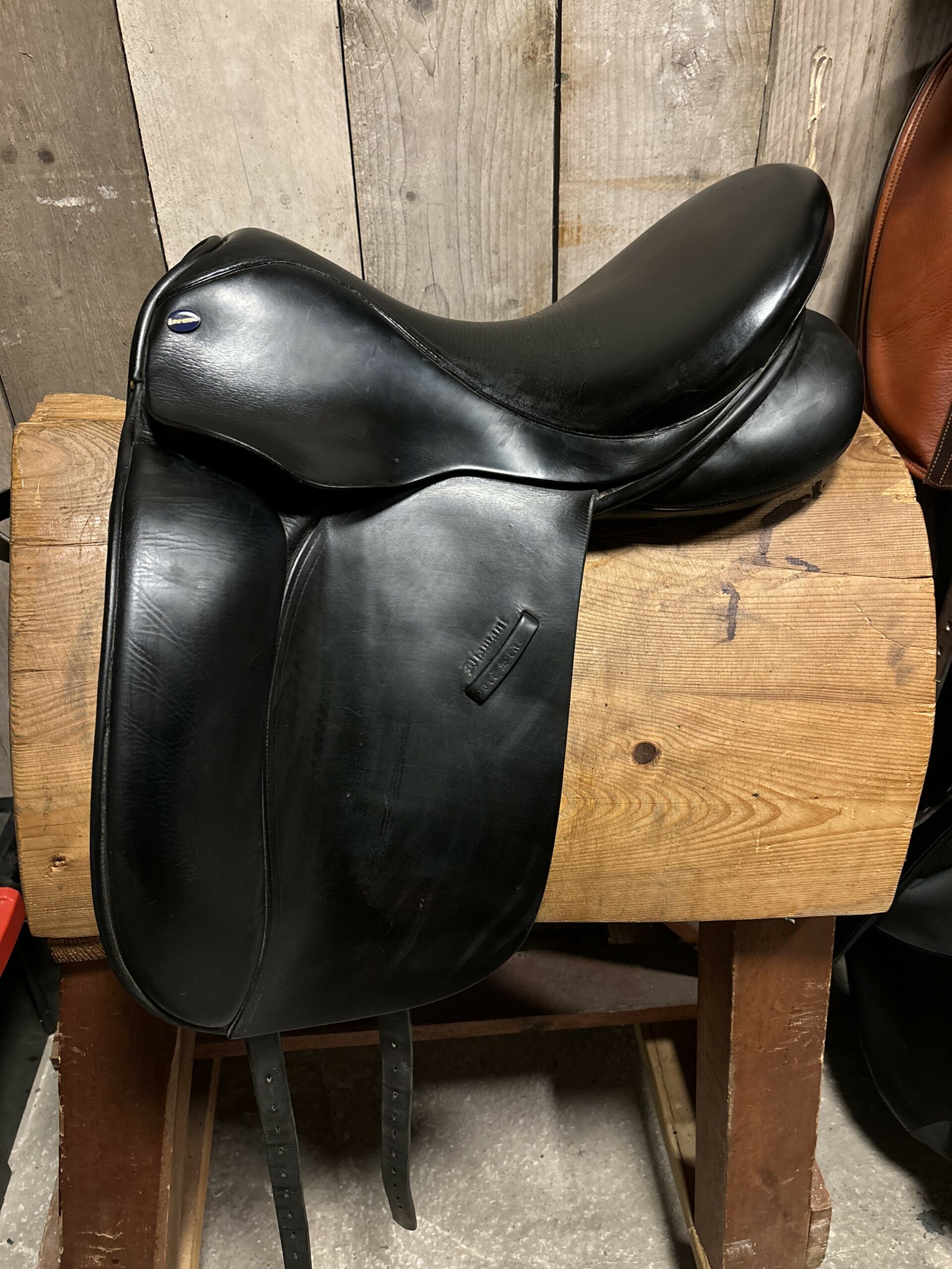 Euroriding Diamant Dressuurzadel M/W 17 inch, geschikt voor paarden met een normale tot hoge schoft. Zadel heeft gebruikerssporen op het zitvlak. Zadel is zwart.