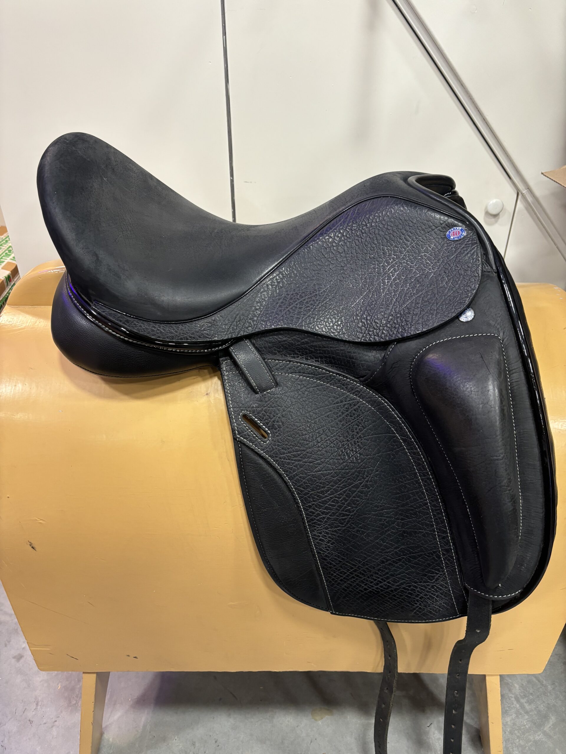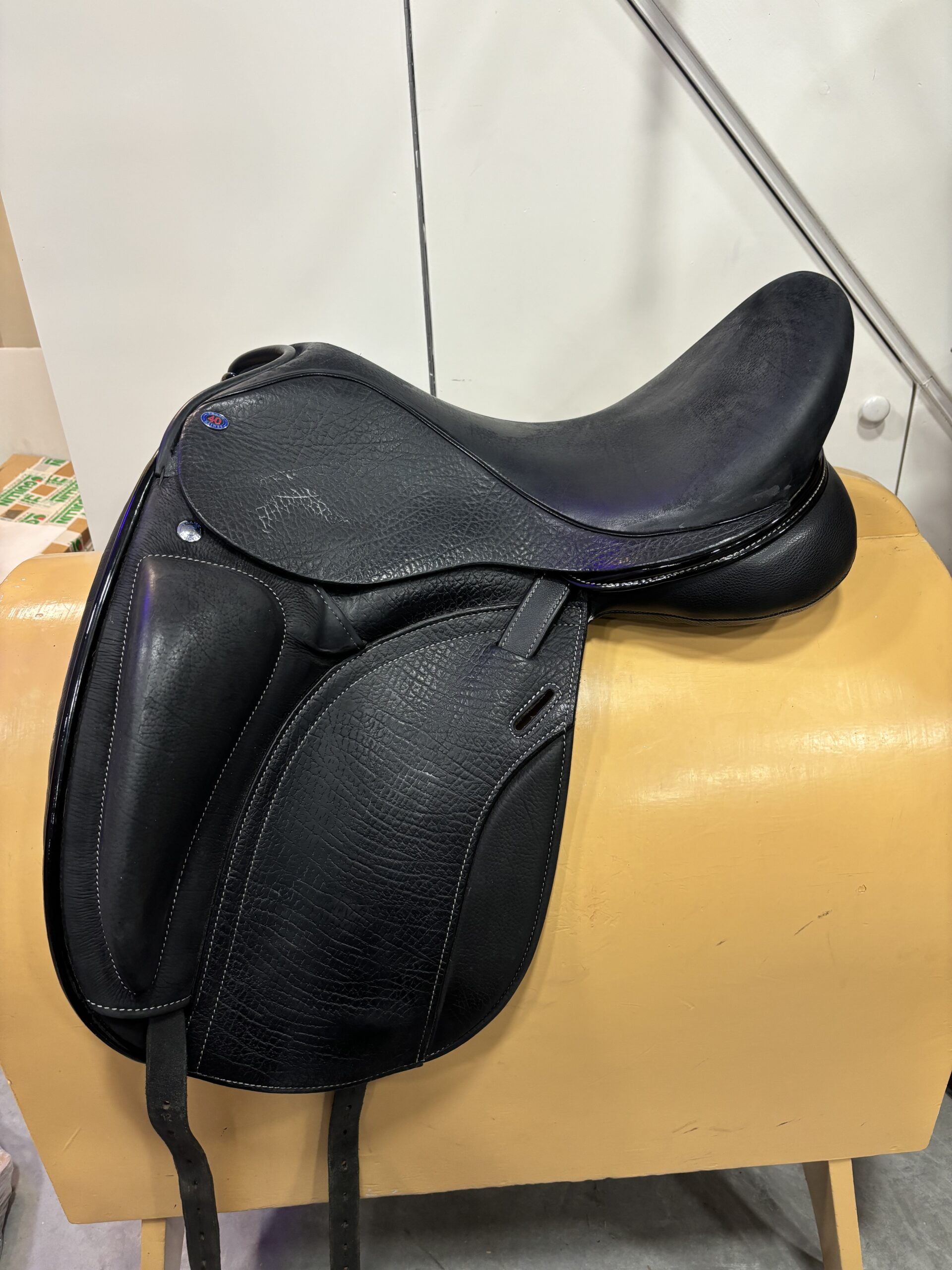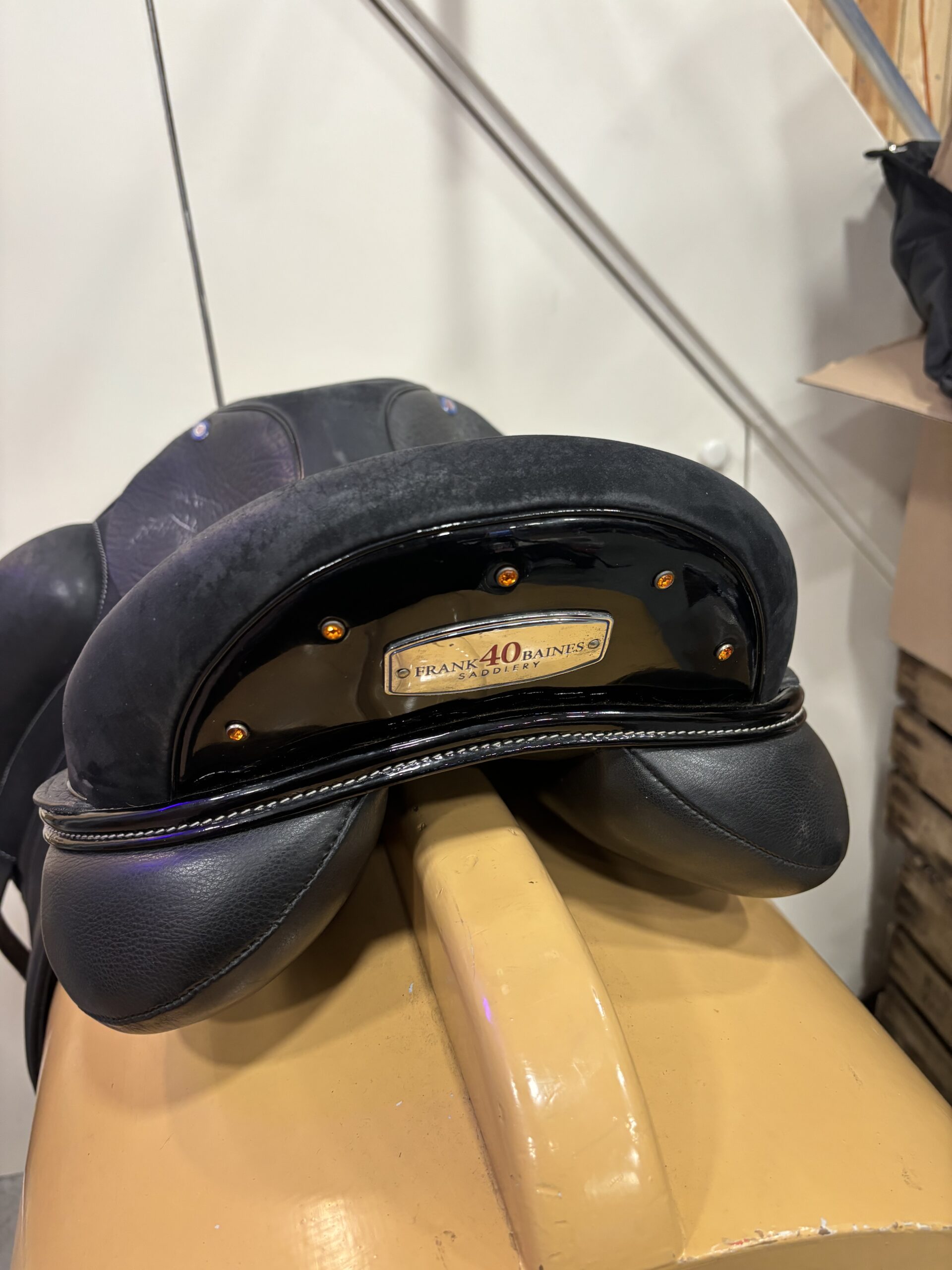 Frank Baines Adagio 17.5 inch dressuurzadel met suède zitting, oranje stenen en lak achterkant. Medium boommaat. Zadel is zwart.
