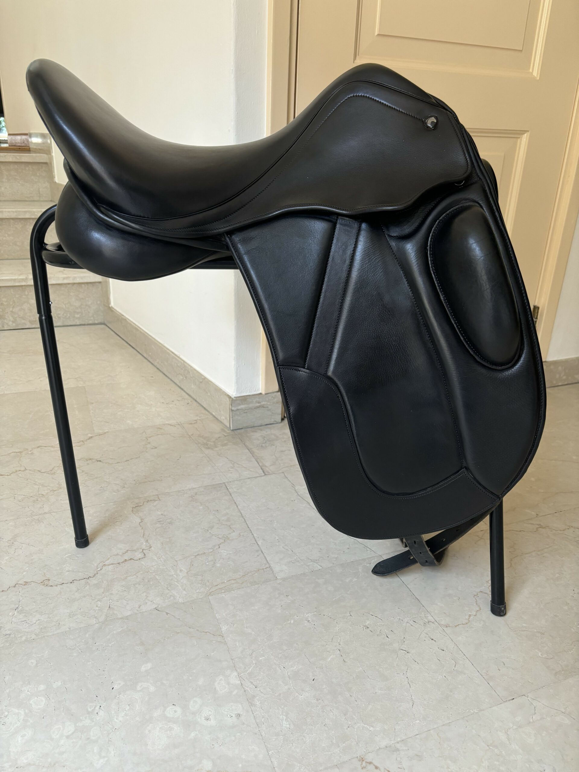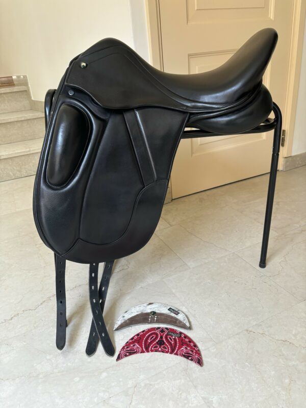 Graziozo dressuurzadel 17.5 inch, geschikt voor paarden met een hoge schoft. Kopijzer is verwisselbaar, momenteel zit hier een narrow in. Ook zijn de achterkantjes eenvoudig te verwisselen naar wens. Zadel is zwart.