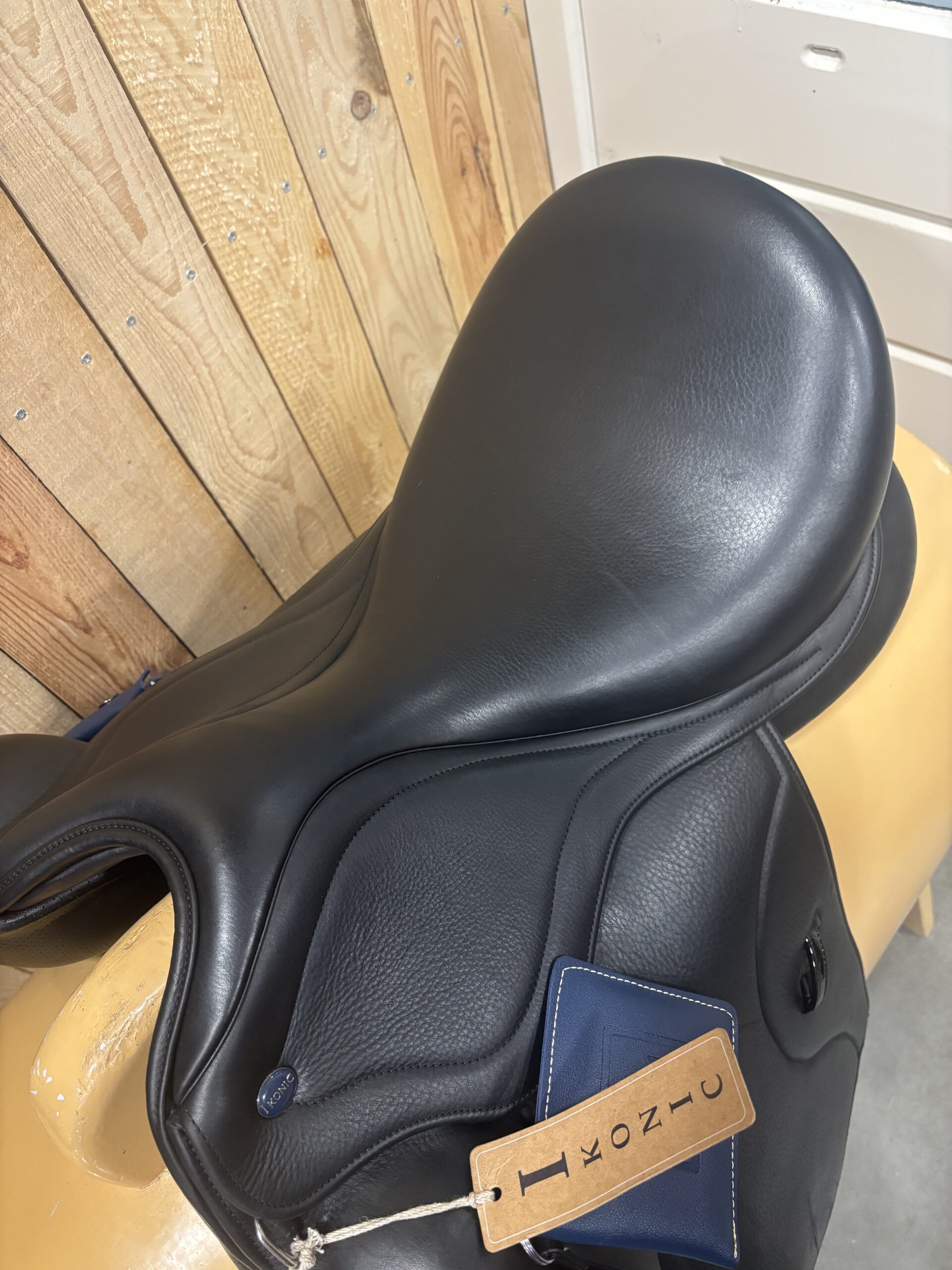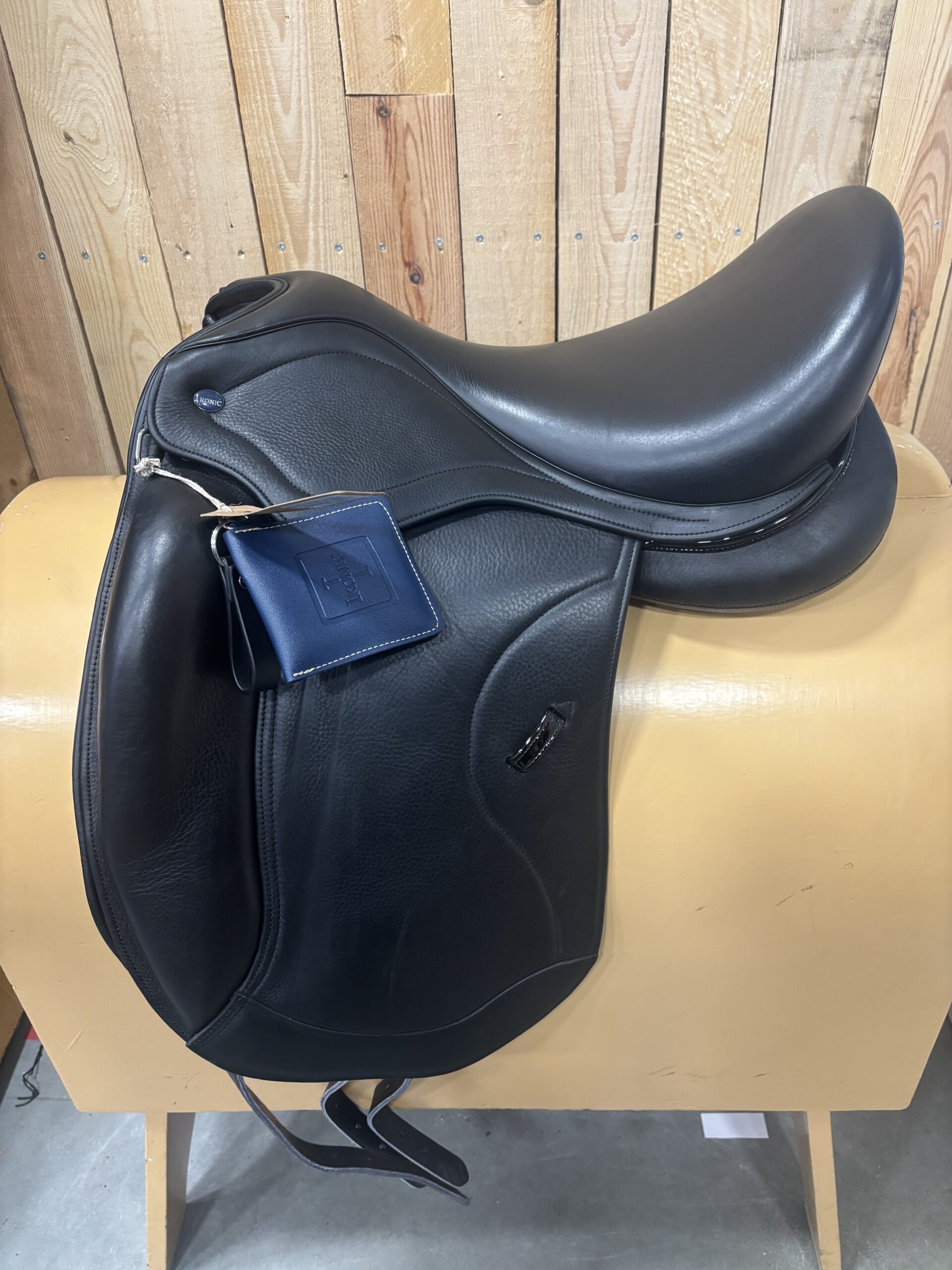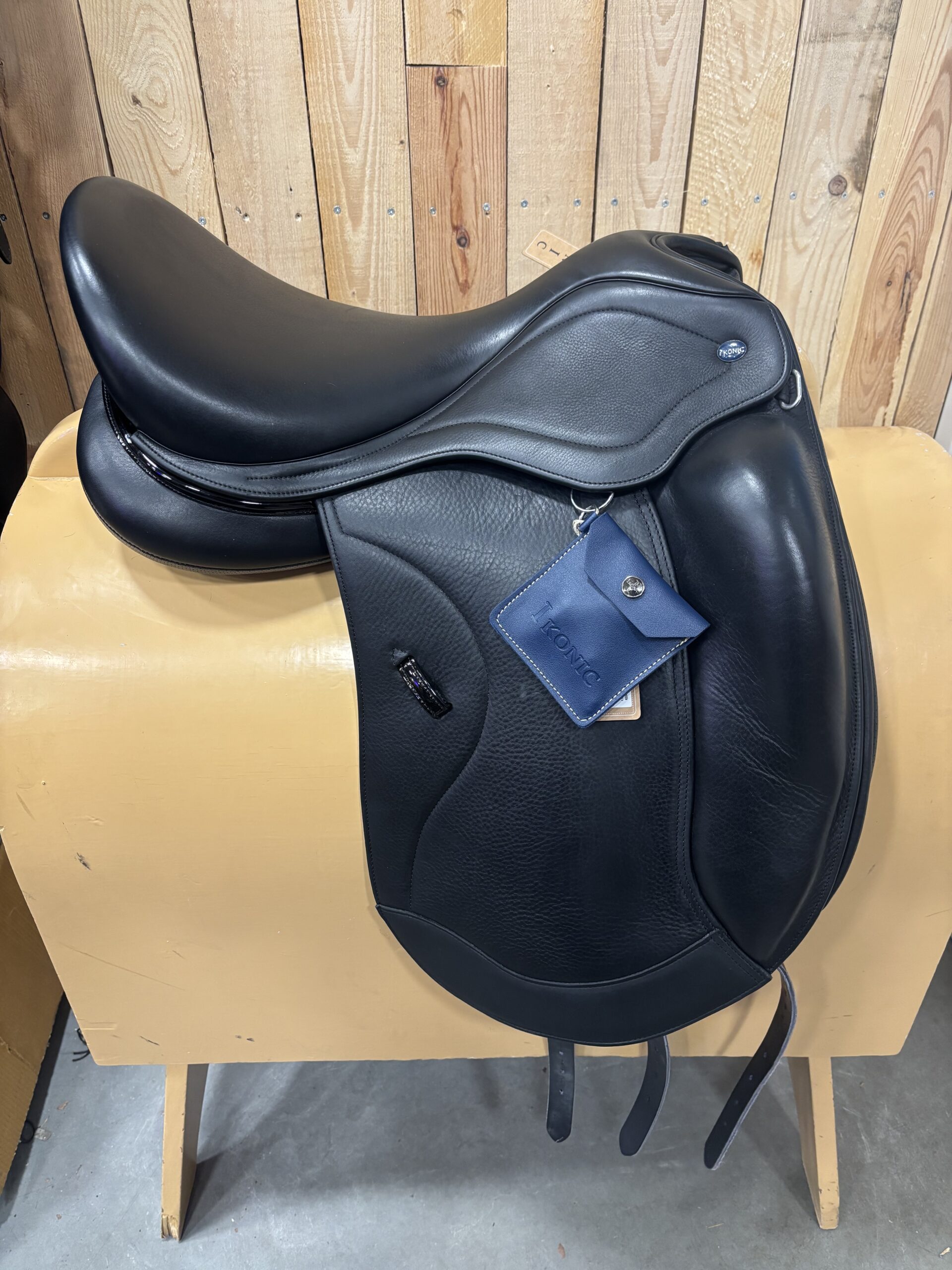 Ikonic Light dressuurzadel 18 inch met een verwisselbaar kopijzer, er kan een maat naar keuze worden ingezet. Zadel heeft dikkere panelen voor paarden met een curve in de rug. Is gebruikt als paszadel. Zadel is zwart.