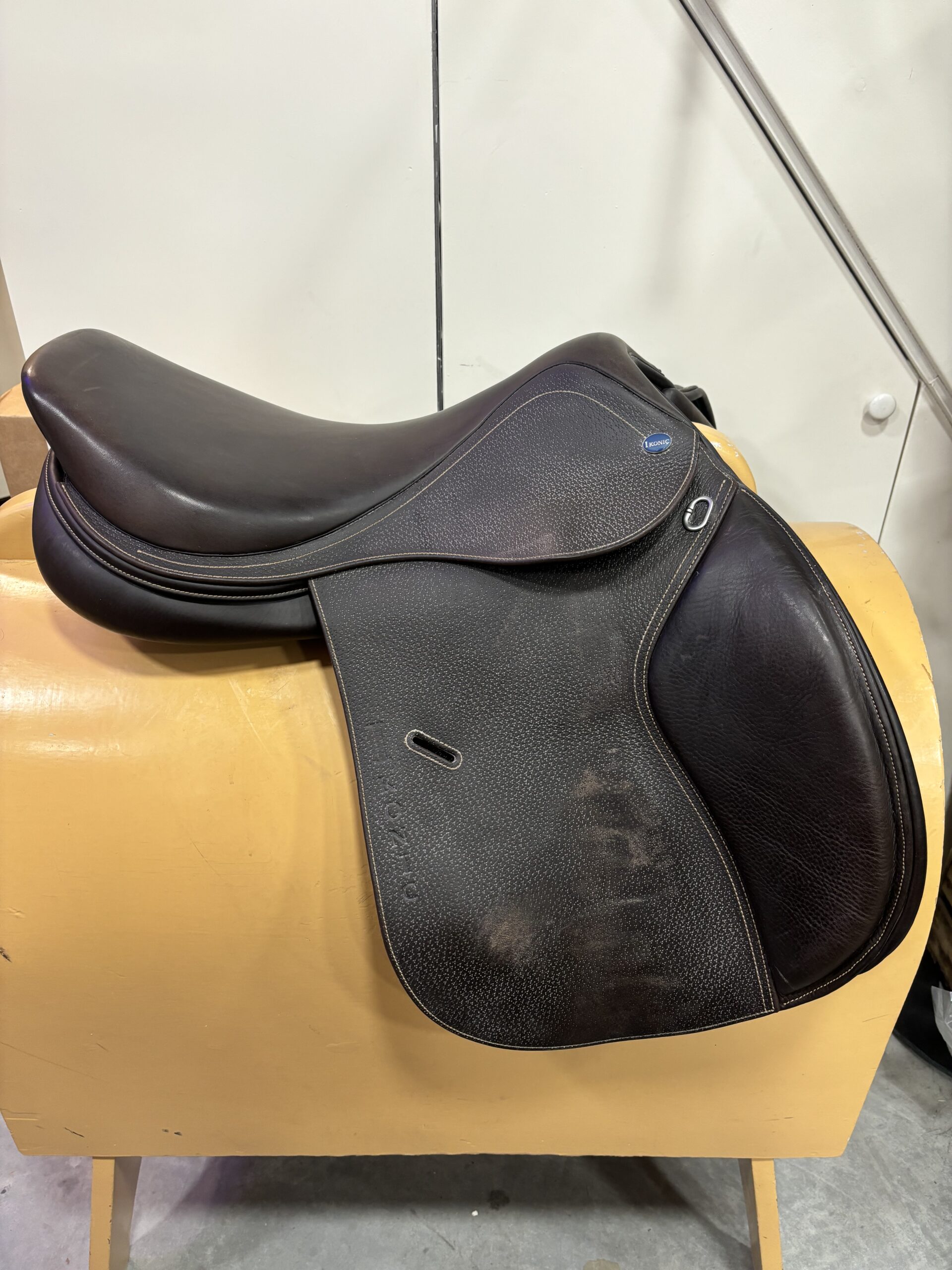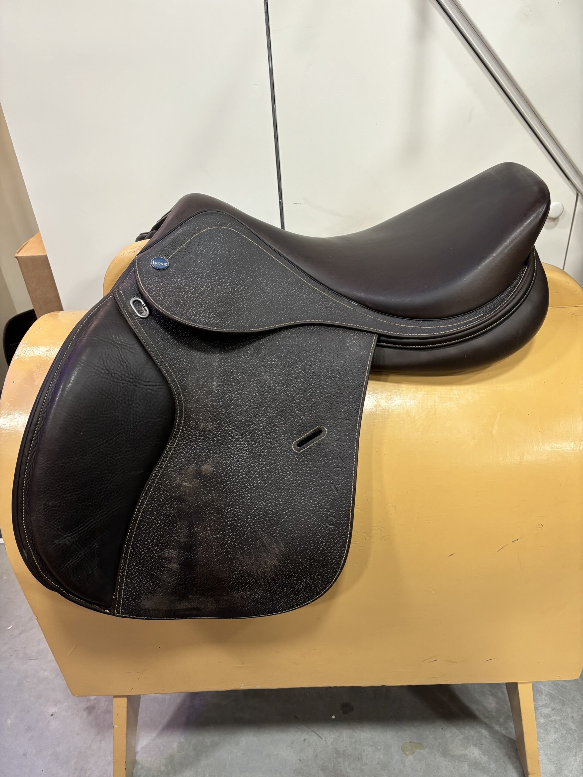 Ikonic 17.5 inch springzadel. Met verwisselbaar kopijzer, momenteel zit er 2x extra wide in. Zadel is bruin.