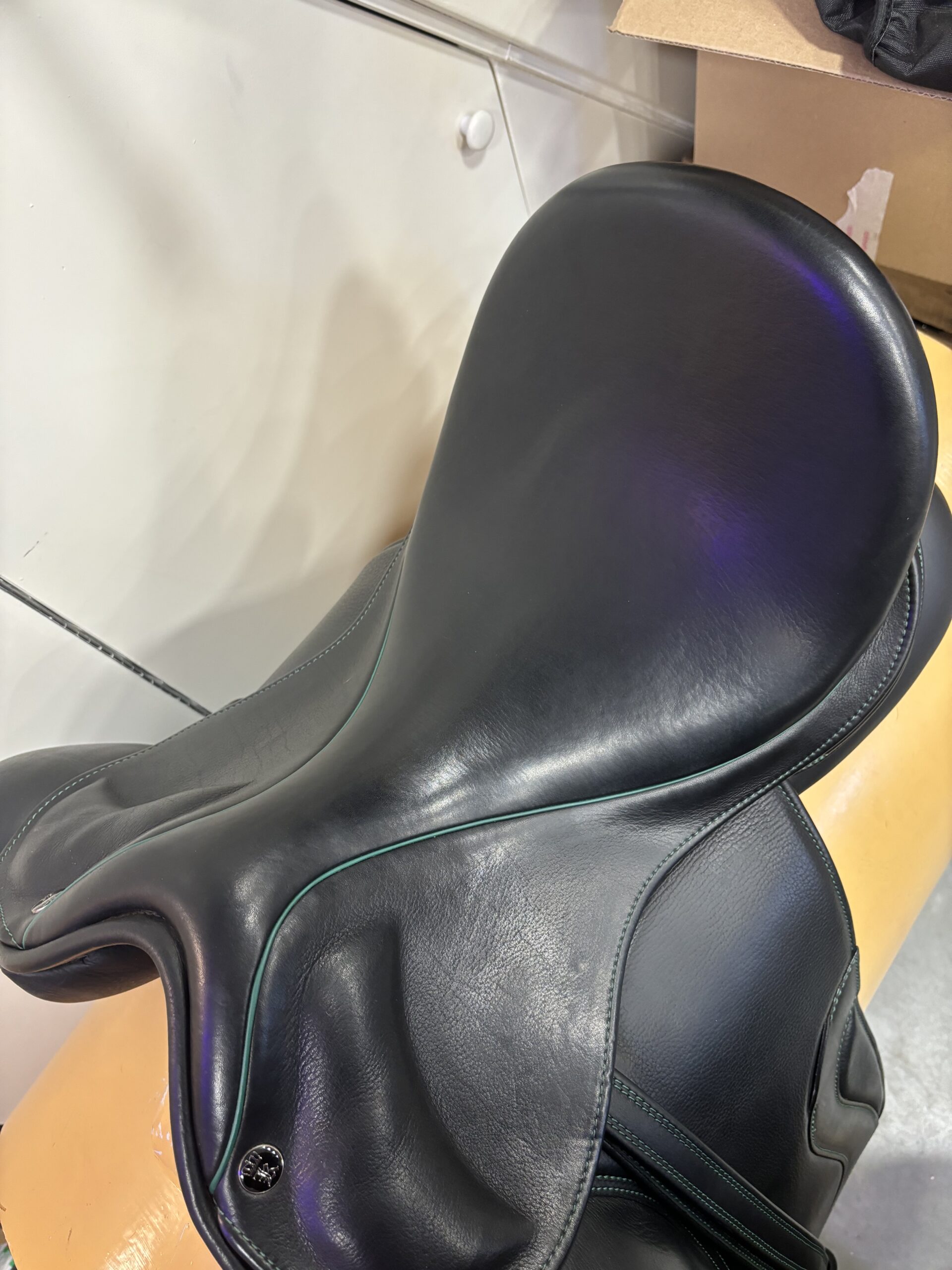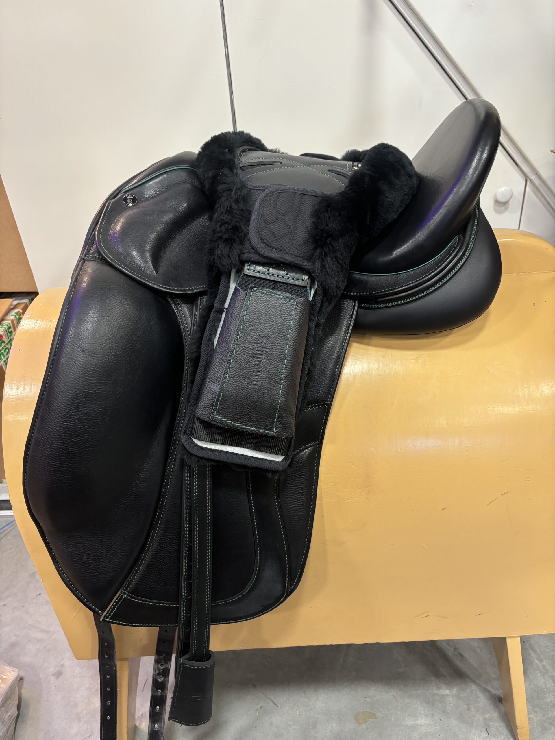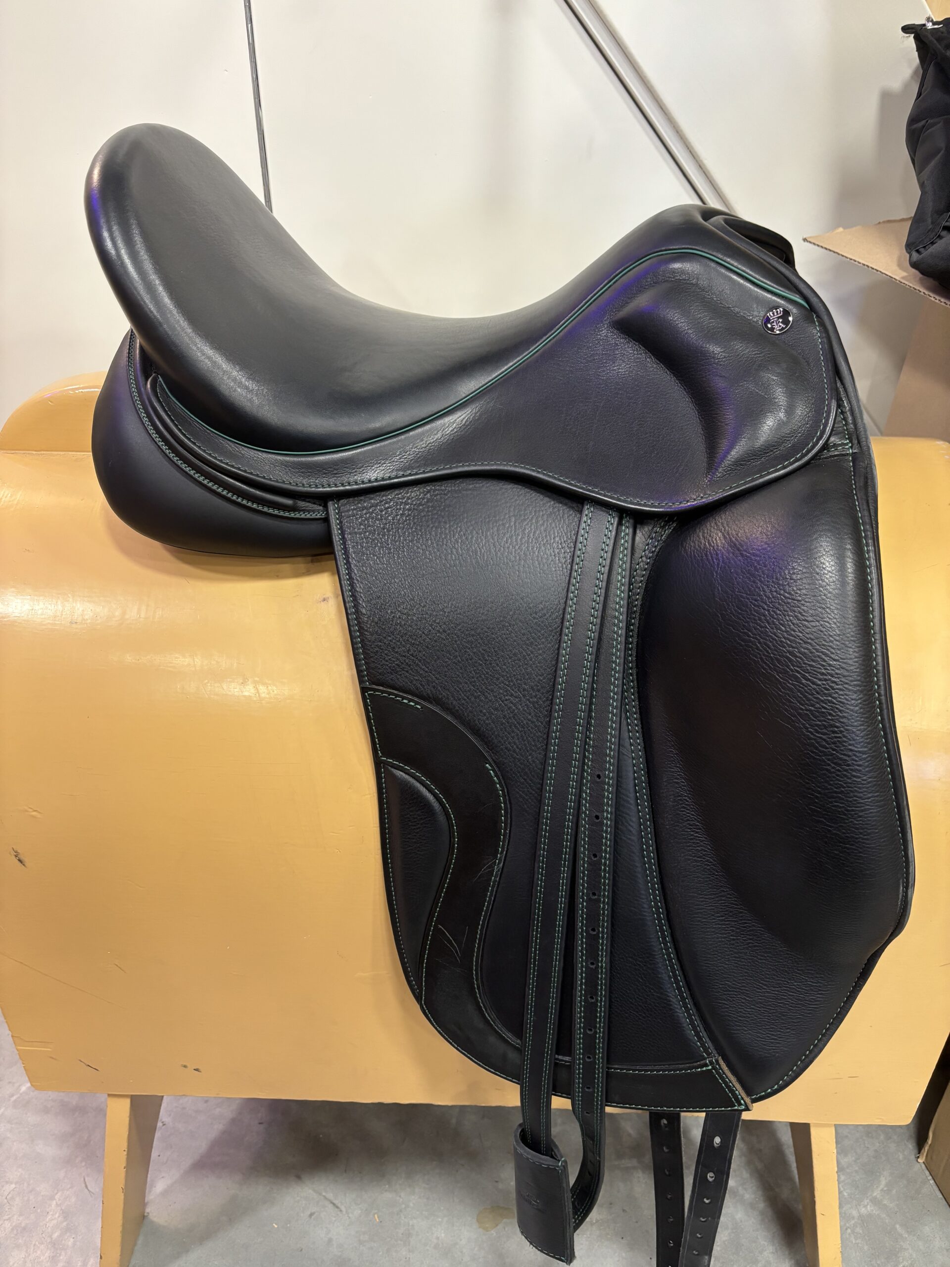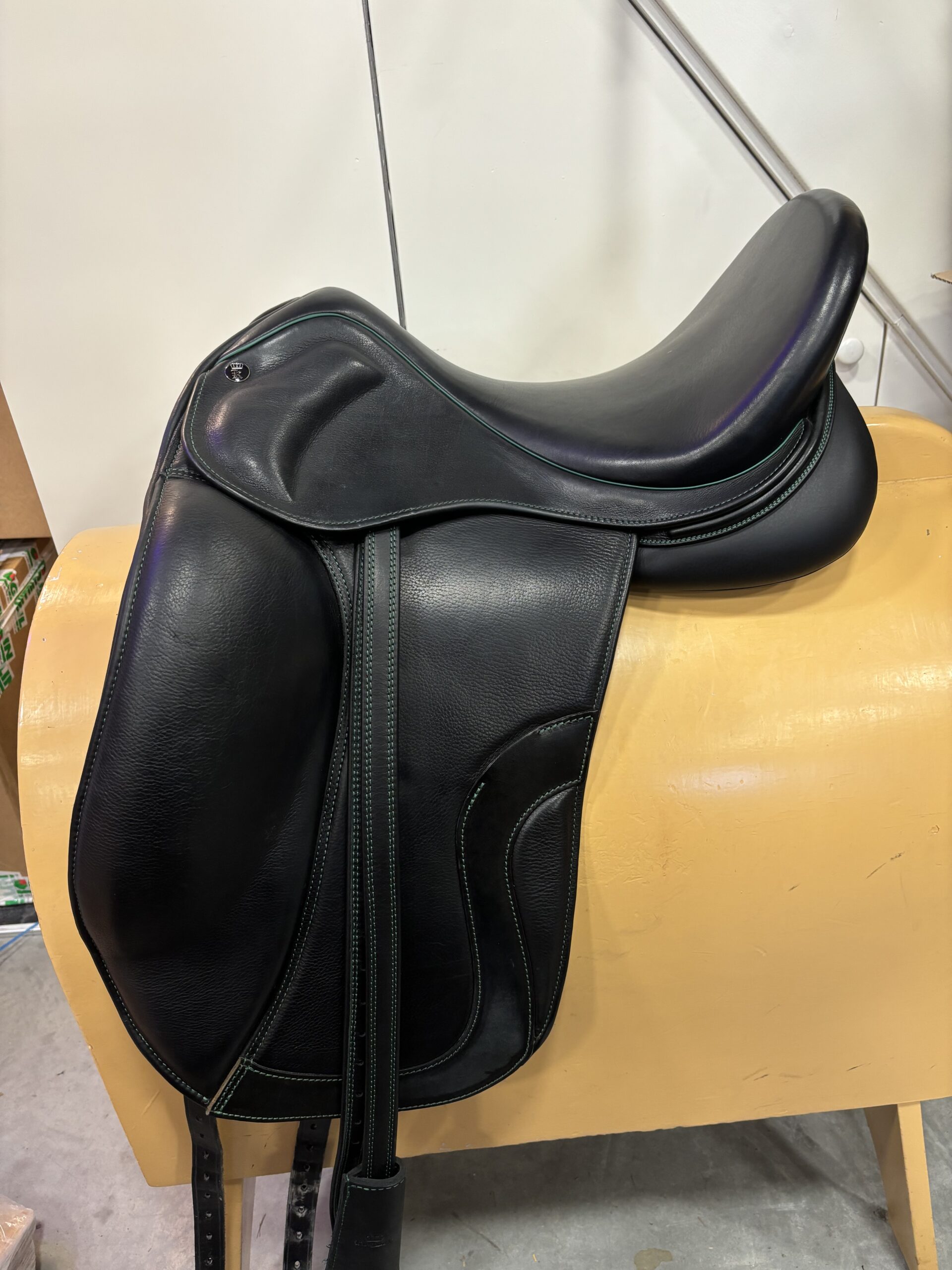 Kingsley D4 18 inch dressuurzadel met groene details en een python achterkant. Medium/wide boommaat. Bijpassende singel, singel bontje en beugelriemen worden erbij geleverd. Zadel is zwart.