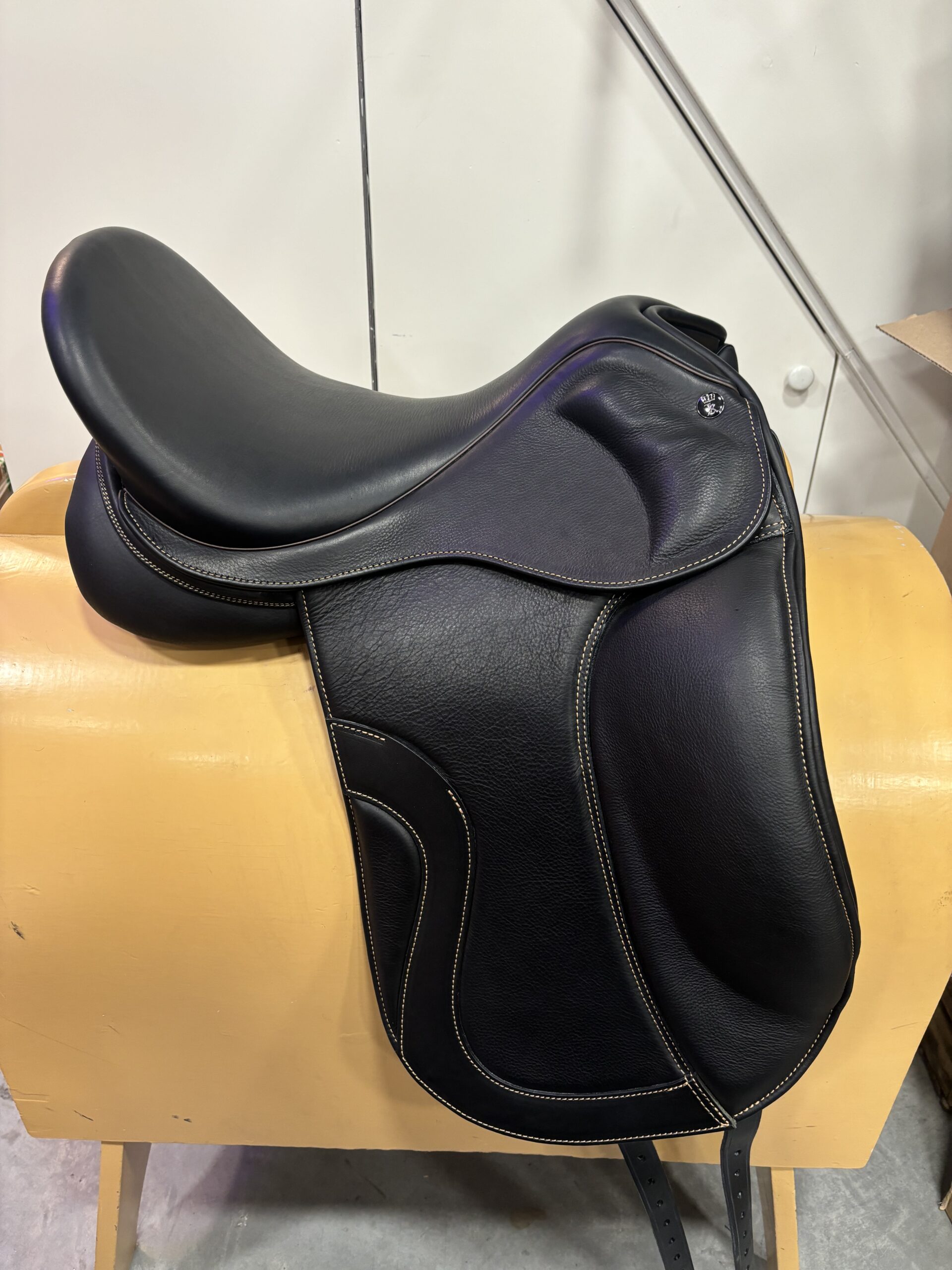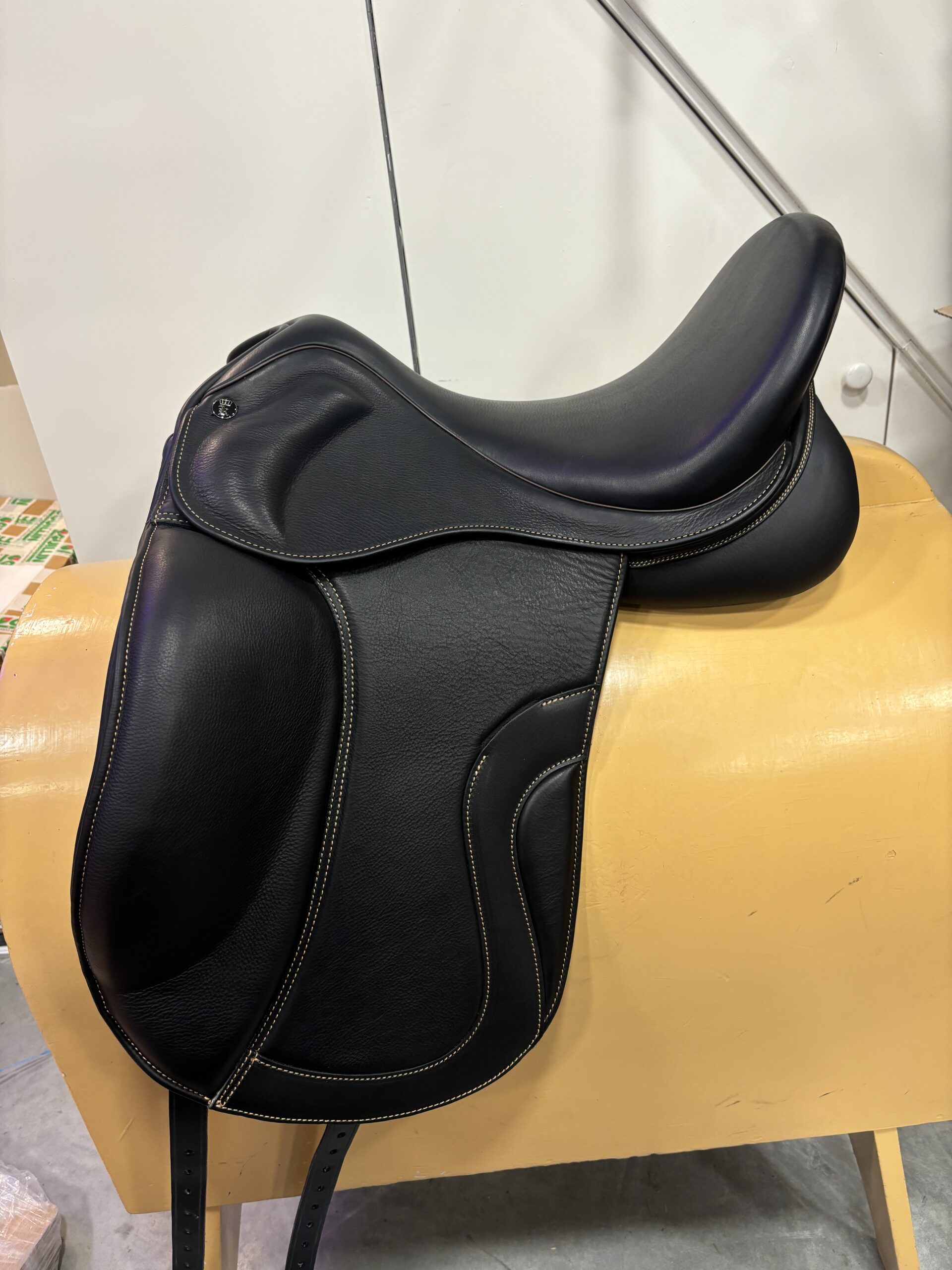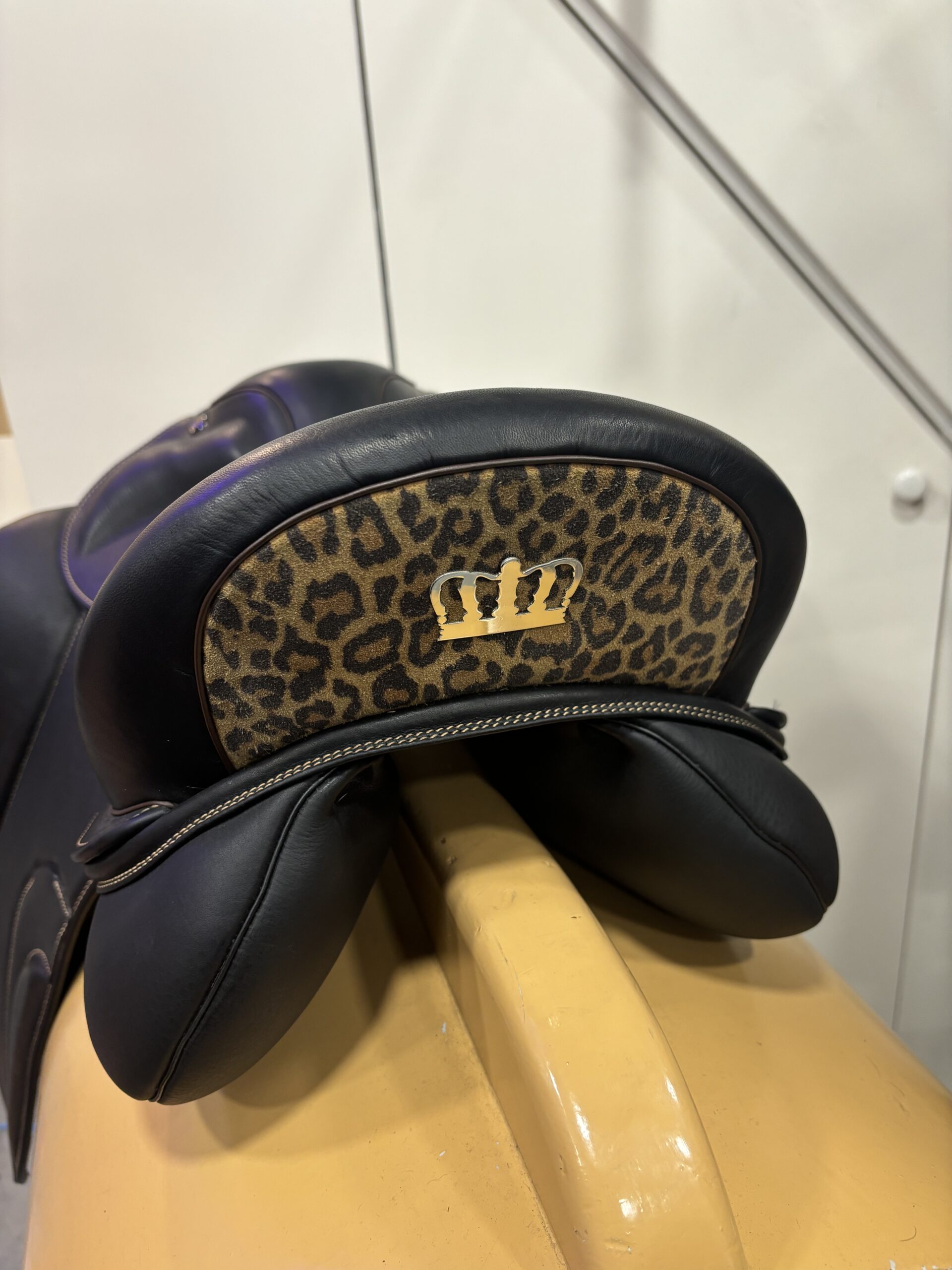 Kingsley D4 18 inch dressuurzadel. Medium boommaat. Zadel heeft beige piping en een panterprint design op de achterkant. 2x gebruikt als paszadel. Zadel is zwart.