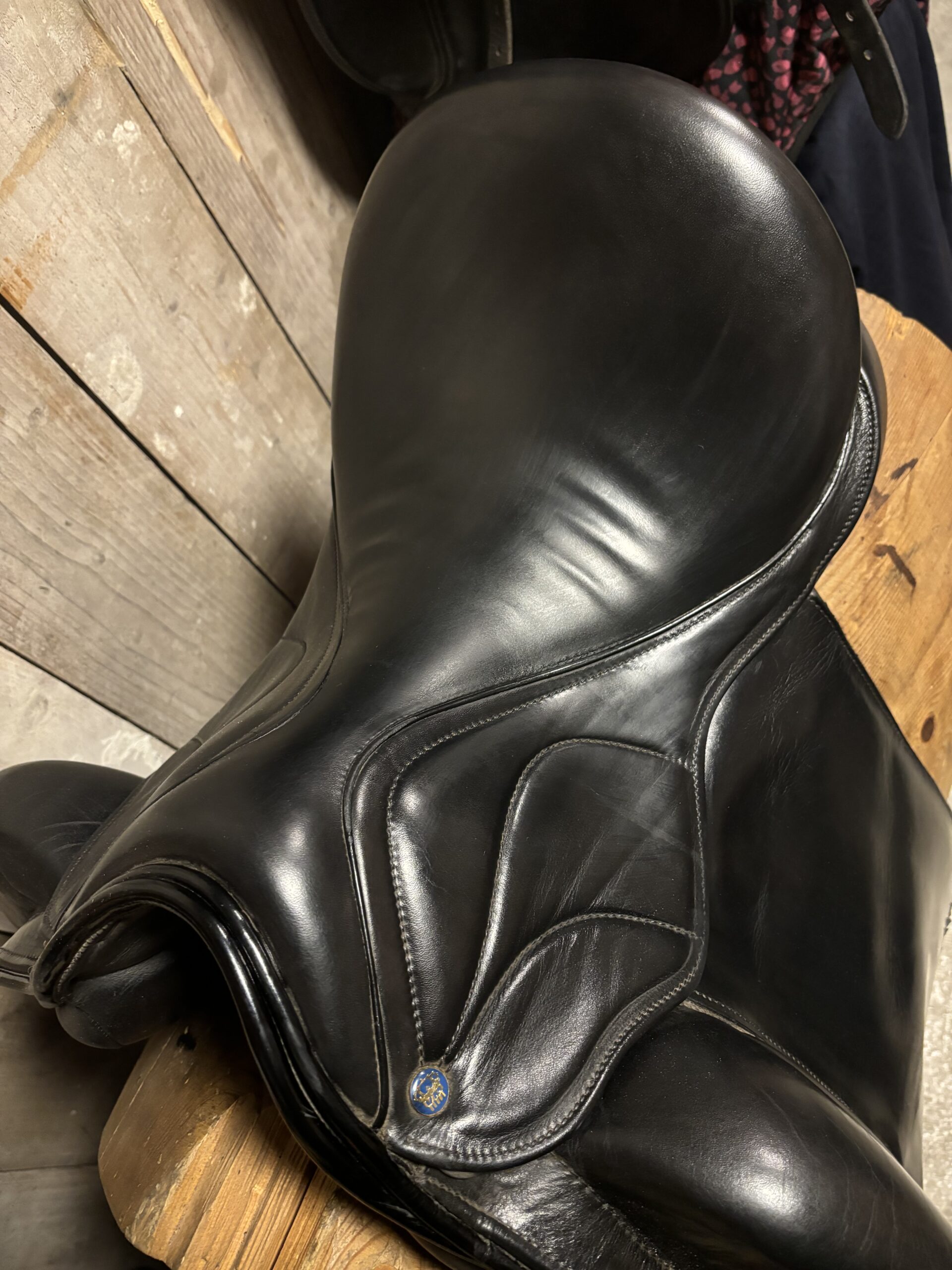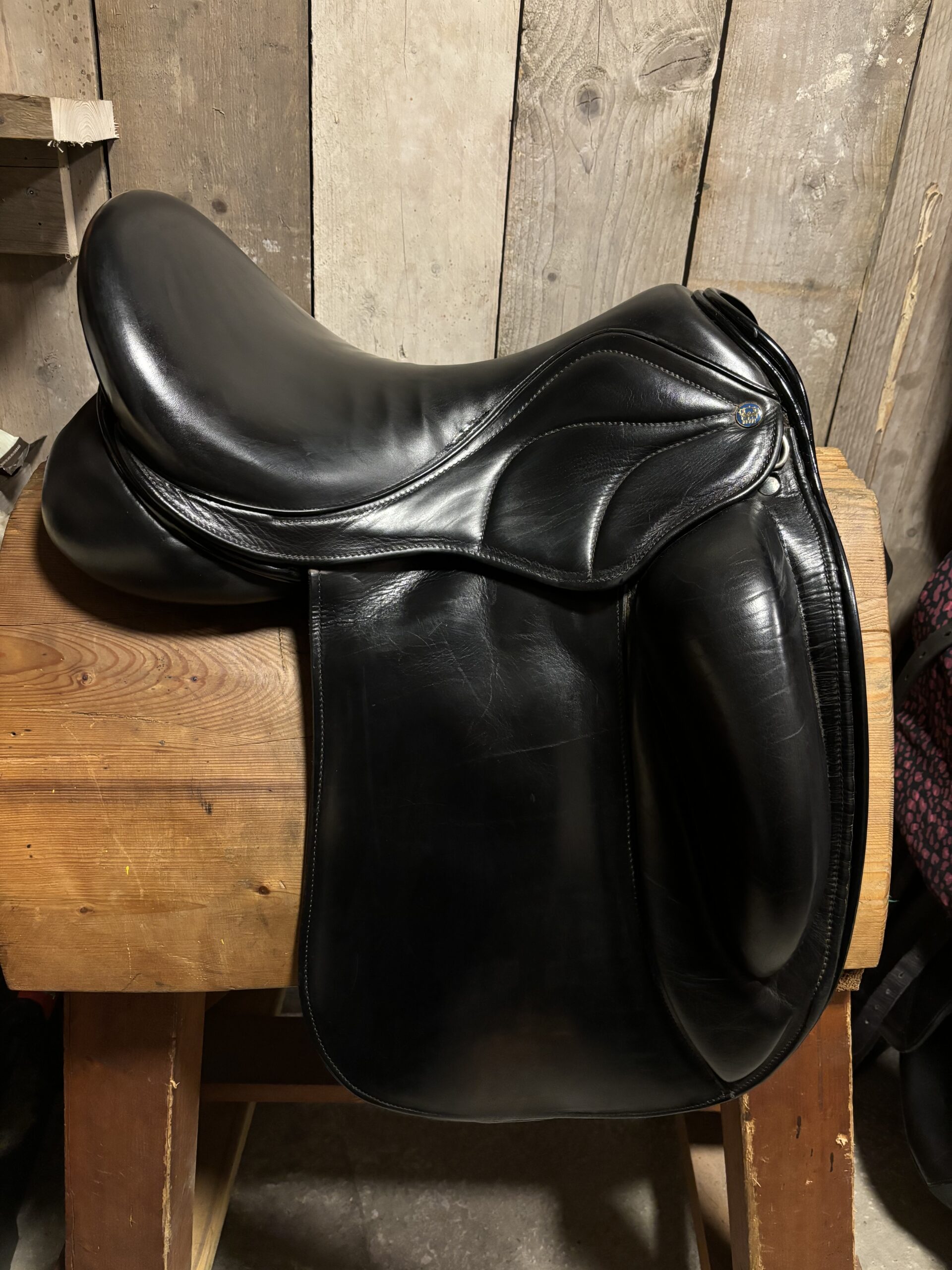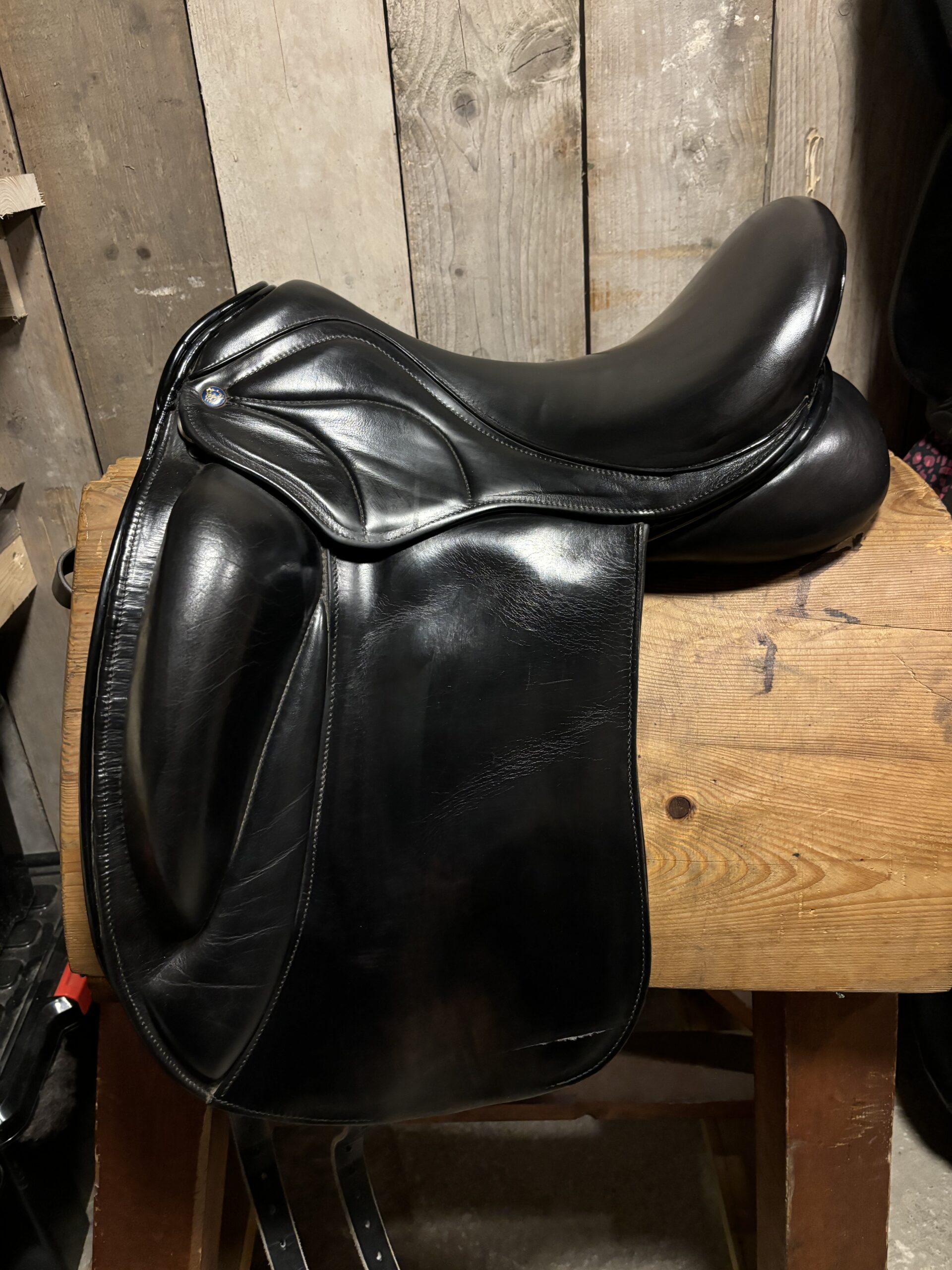 KM Custom Made Dressuurzadel met een medium boom. Geschikt voor paarden met normale tot hoge schoft. Zitting heeft gebruikerssporen. Zadel is zwart.
