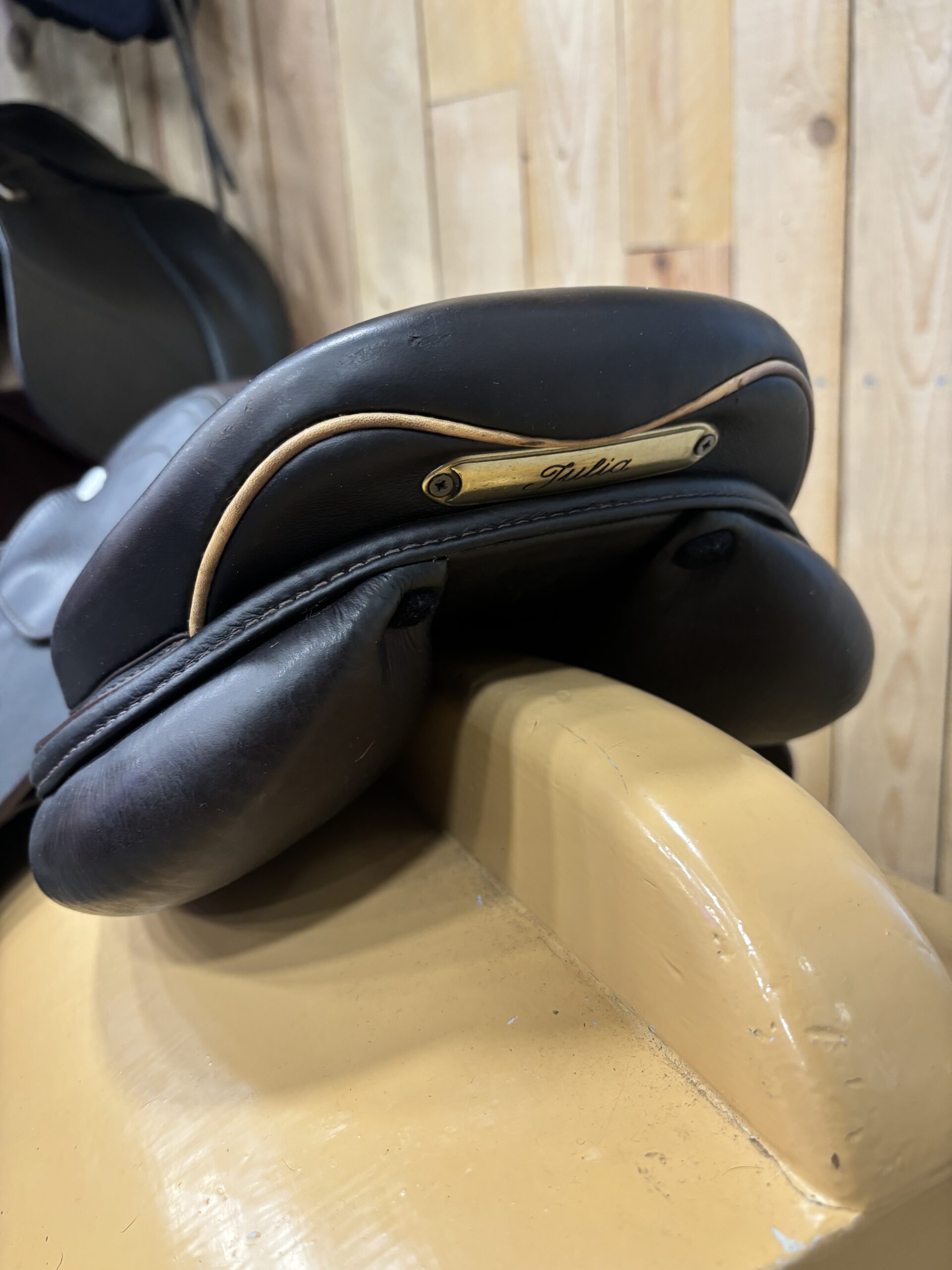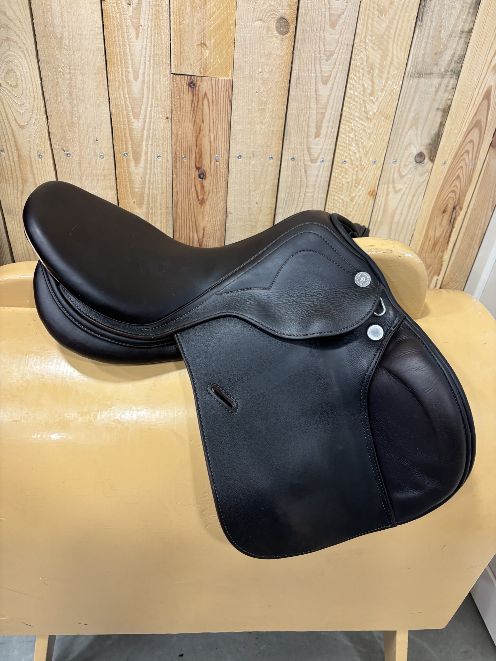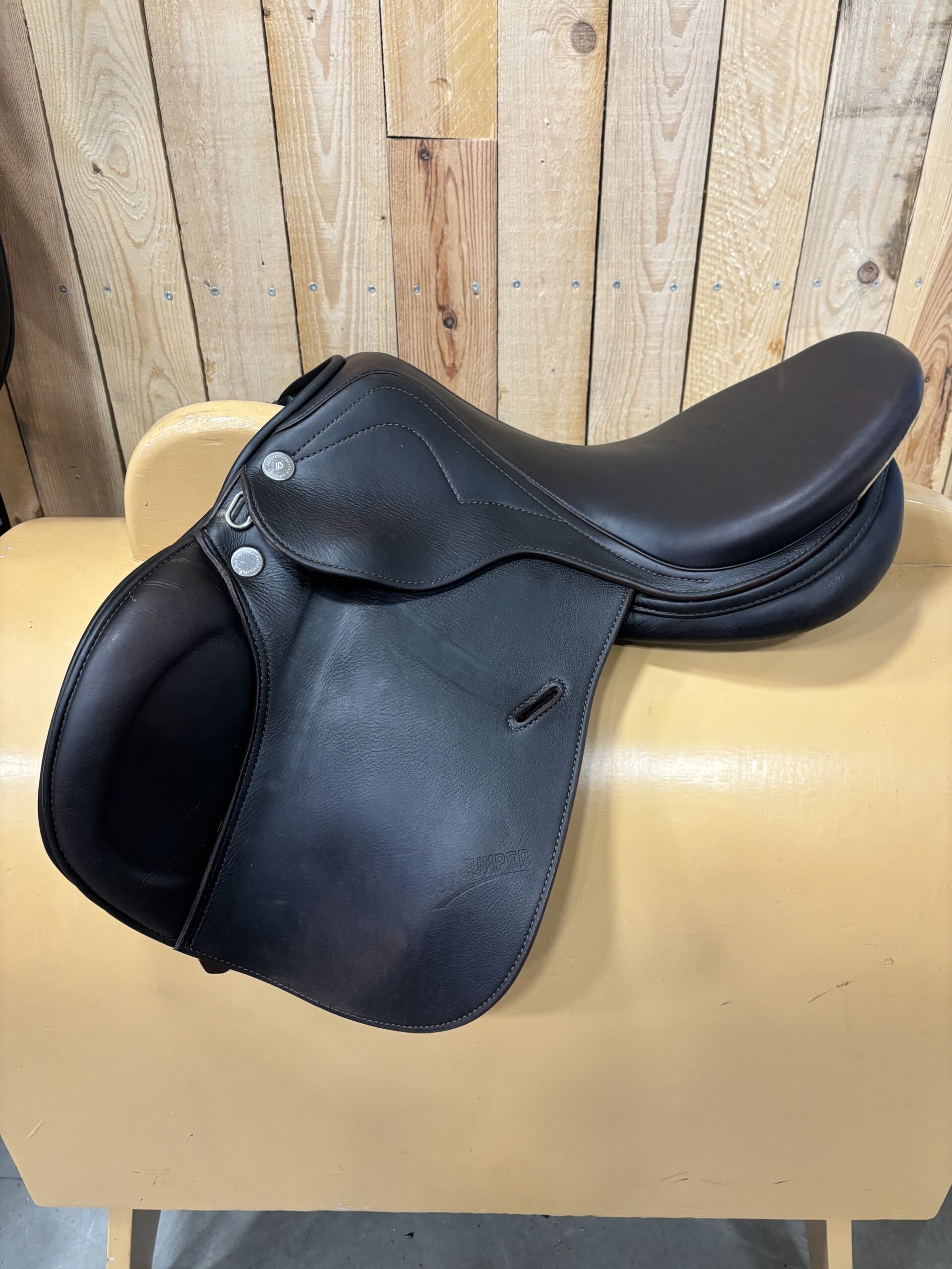 Prestige Joy Jumper 16 inch springzadel. Boommaat is een 35, wide. Zit een naamplaatje op, kan eenvoudig worden veranderd. Zadel is bruin.