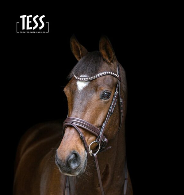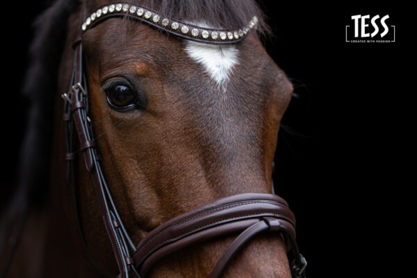 Je ontvangt jouw hoofdstel met de TESS Frontriem Stellux Crystals, met een enkele rij schitterende witte Stellux stenen. Een TESS High End Crystal Frontriem waarbij je de kleuren van de stenen zelf kunt samenstellen, is indien gewenst los verkrijgbaar.